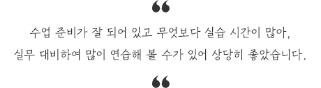 제 생각 이상으로 단시간 실력이 올라왔고 ‘바로 취업을 해서 일을 할 수 있겠다.’는 생각이 바로 들 정도의 훈련내용이었습니다.