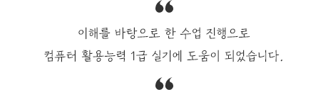 컴퓨터에 대해 하나도 모르는 상태였는데 하나하나 자세히 설명해주시더라구요~ 덕분에 실기 공부에 도움이 많이 된 것 같습니다! 모르는 내용을 전문 강사님께 물어보고 더 쉽게 푸는 법을 배울 수 있어서 좋았습니다!