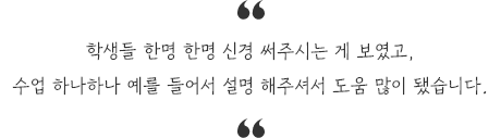 상세하게 설명도 잘해주시고 이해가 힘들면 반복적으로 계속 말씀해주셔서 이해하는 데 도움이 잘 됐습니다. 문제 풀이 시 한명 한명 봐주시면서 부족한 부분이나 틀린 부분도 쉽게 설명 잘 해주셨습니다.