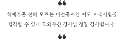 회계는 아예 처음 해보는 거라 걱정 많이 했는데 강사님이 친절하고 꼼꼼하게 가르쳐주셔서 잘 배울 수 있었습니다. 자격증을 위한 강의를 하시면서 실무에서 필요한 정보도 알려주셔서 좋았어요. 꼭 수업뿐만 아니라 시험 관련해서 사소한 것도 신경 써 주셔서 좋았습니다. 강의도 좋았지만 강사님에 대한 만족도가 큽니다!