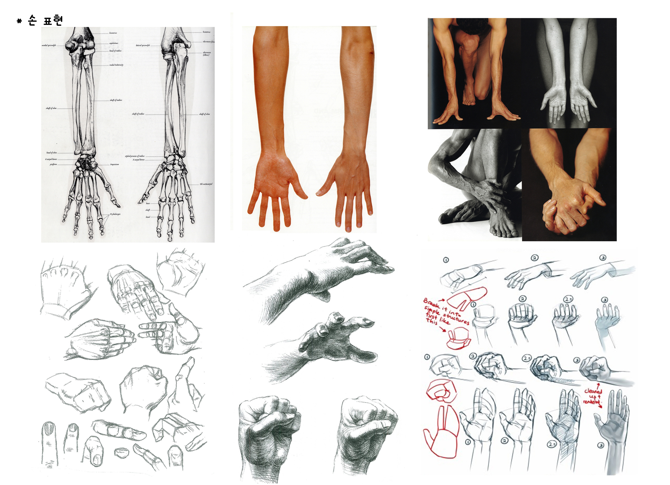 | 얼굴의 골격과 근육을 이해한 후, 얼굴의 움직임에 따른 다양한 표정을 표현할 수 있다. | 손, 발의 골격 구조를 이해하고, 각도의 따른 여러 동작을 표현할 수 있다. | ||